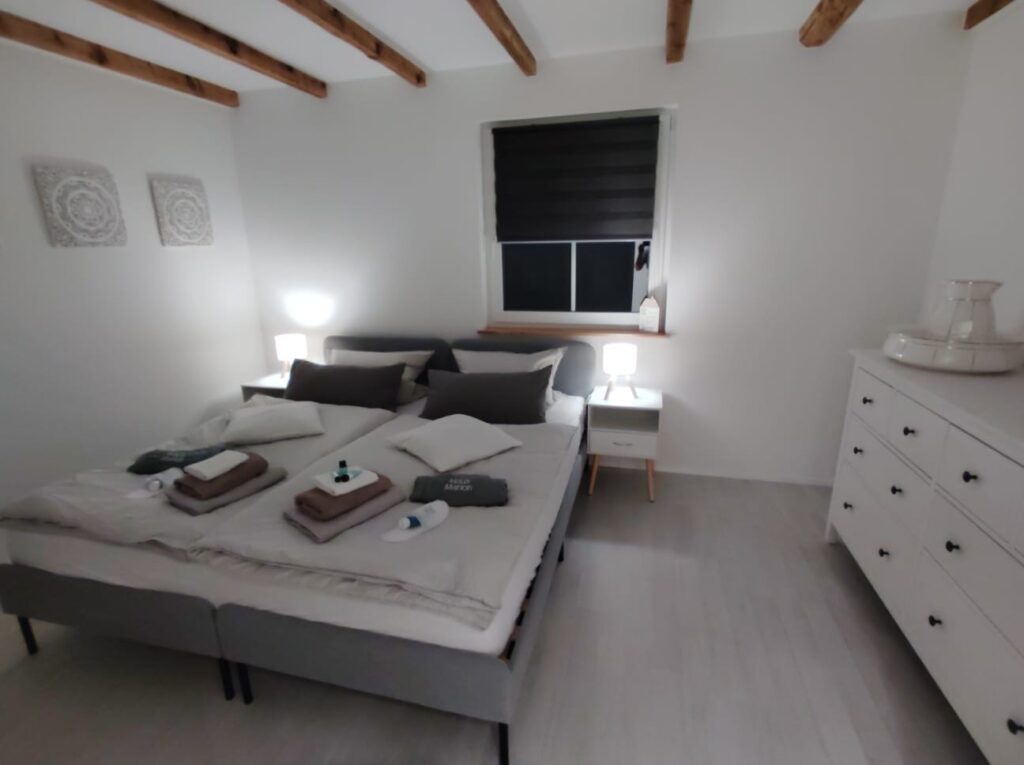 Das Ferienhaus verfügt über ein Kingsize-Doppelbett im Schlafzimmer, ein Schlafsofa für zwei Personen im Wohnzimmer und zwei einzelne 90×200 Betten im Obergeschoss. Bettwäsche stellen wir Ihnen kostenlos zur Verfügung.